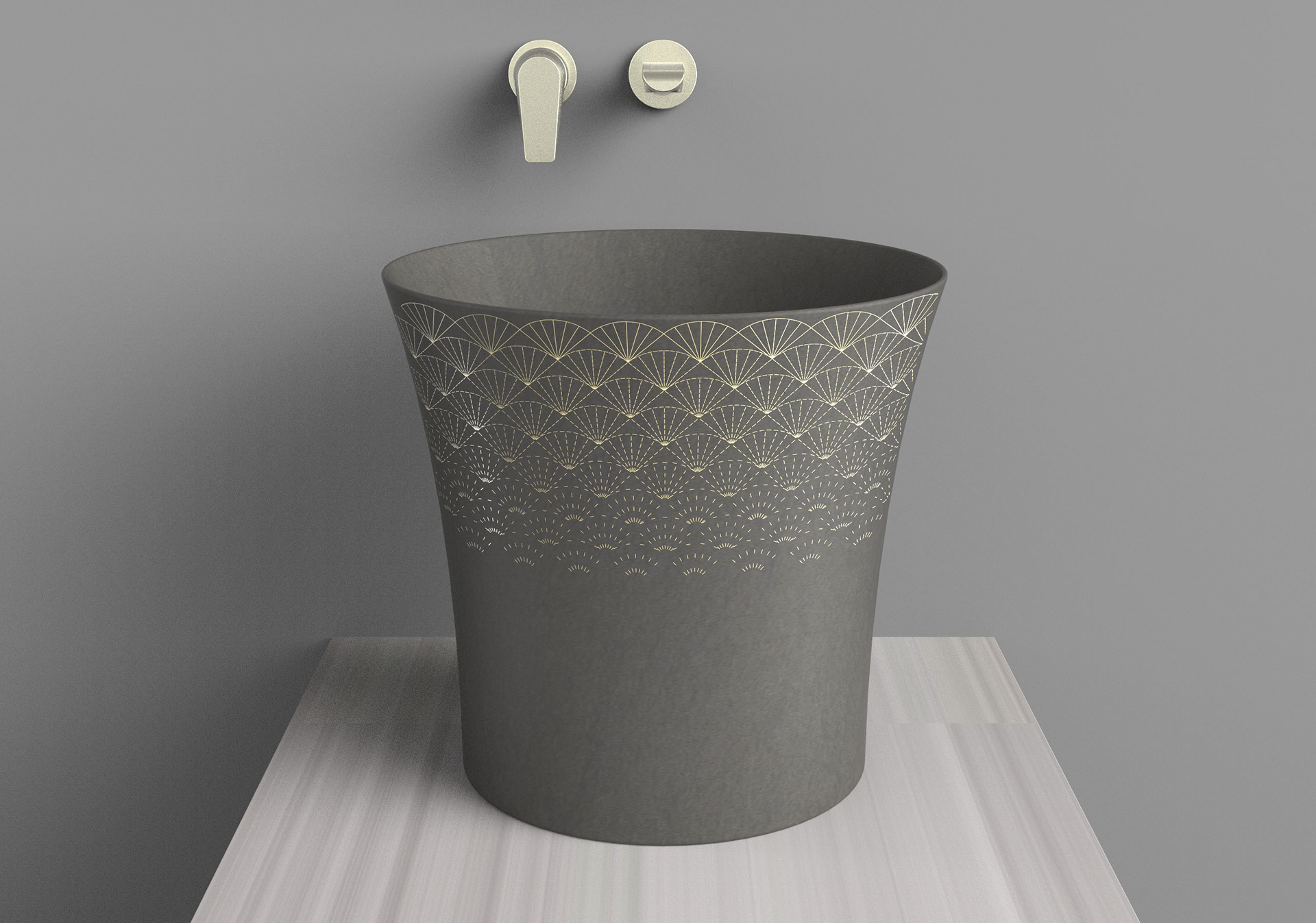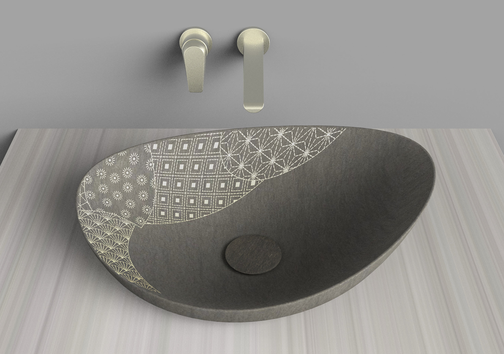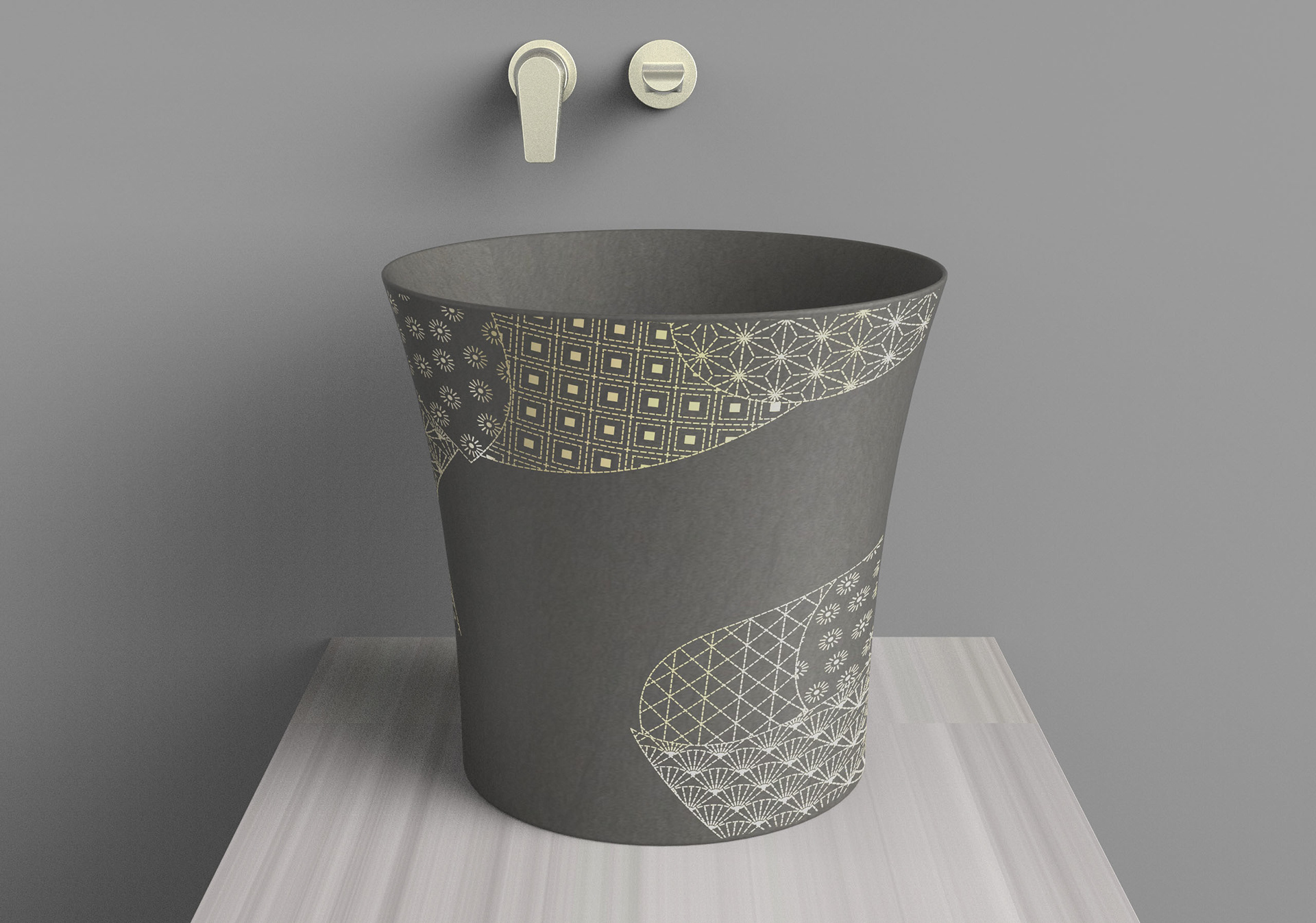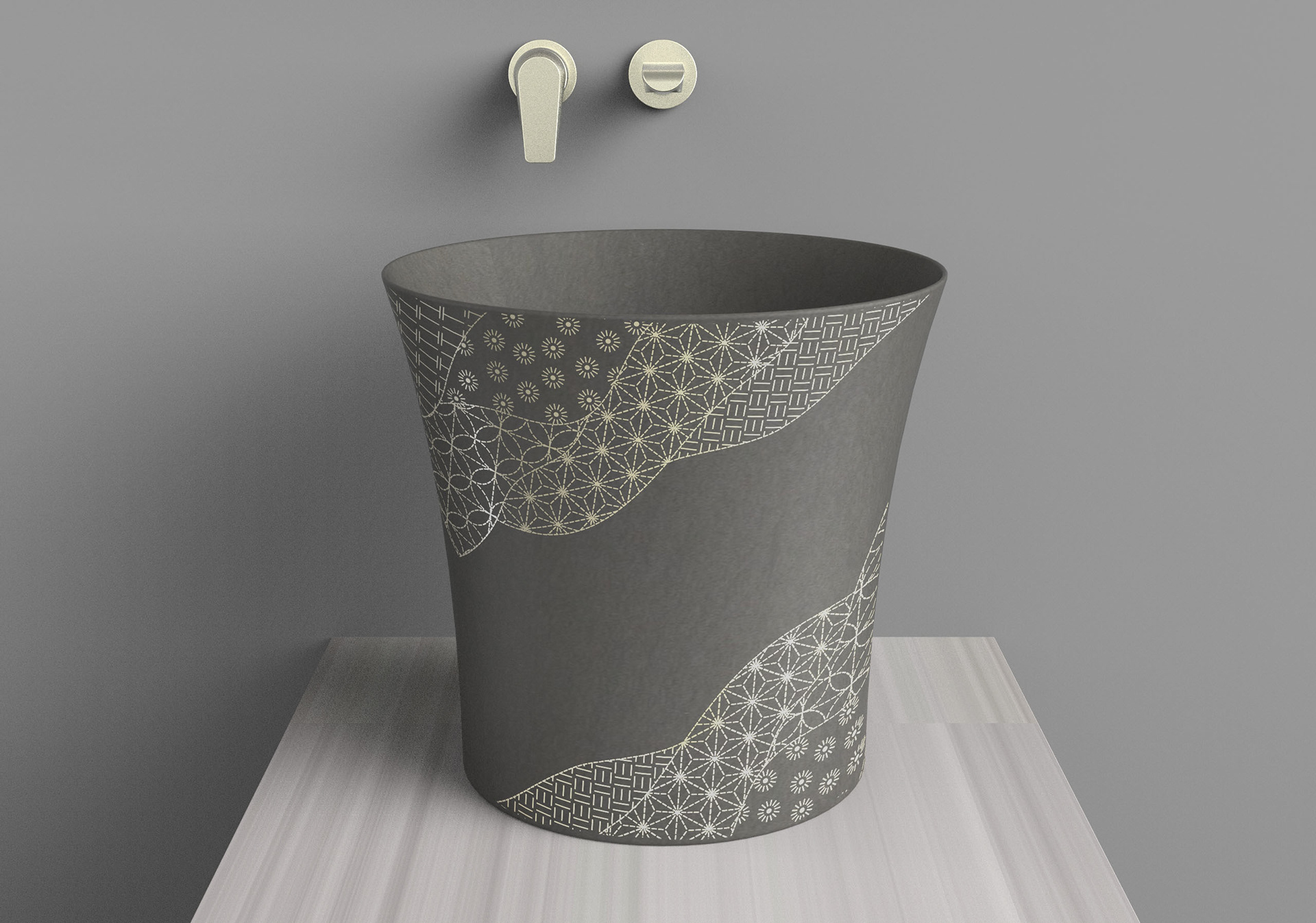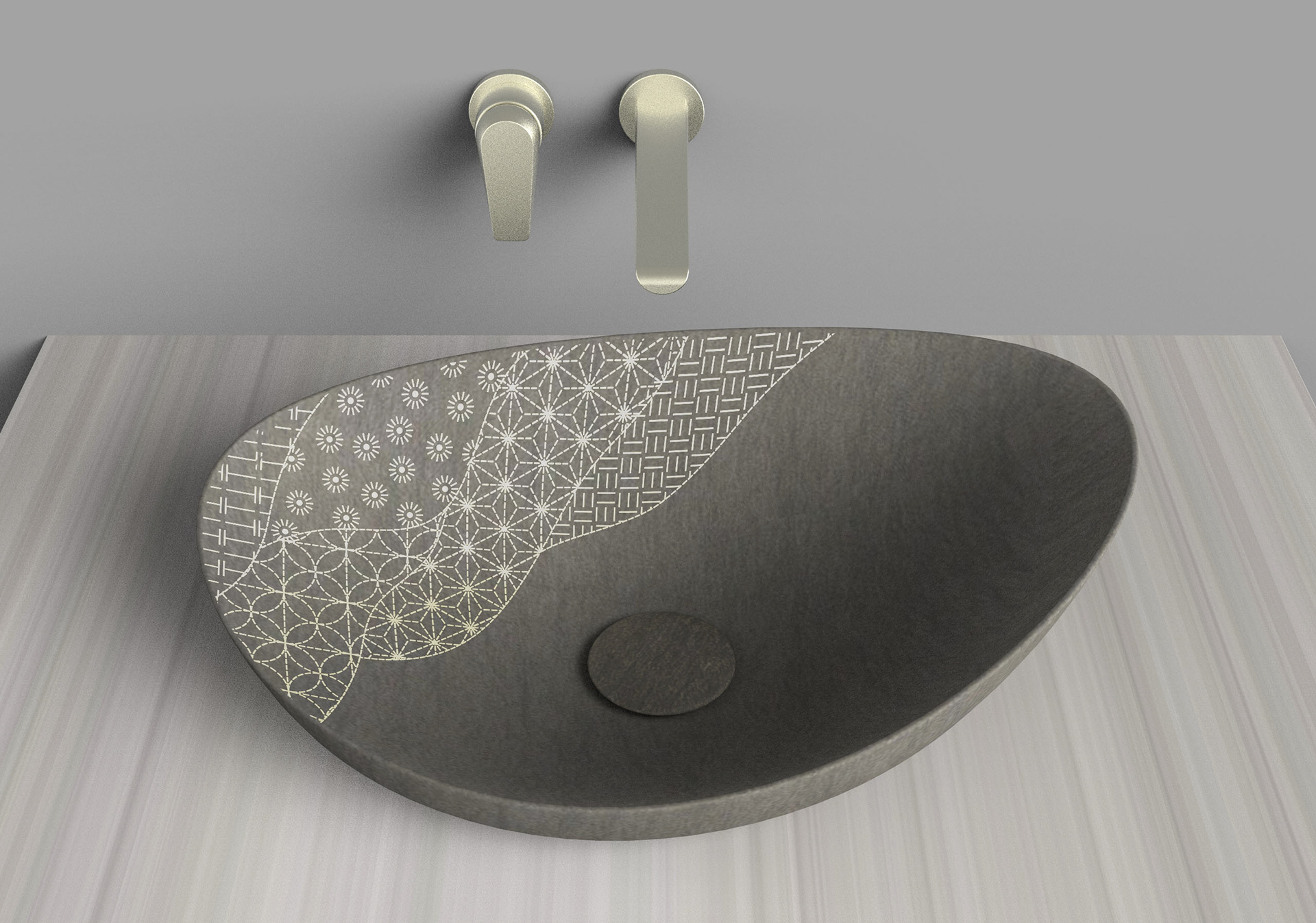 Kensho unearths modern stone vessels for the contemplative vanity. Inspired by the ancient Italian technique aquaforte, Kensho patterns are etched then gilded. A curious dimensionality results, compelling you to touch. We took a deep dive into Japanese sashiko patterns to develop the signature patchwork.